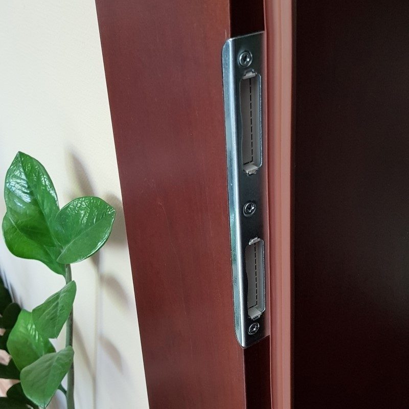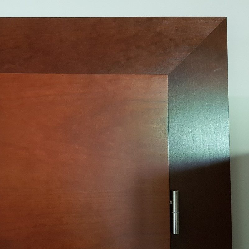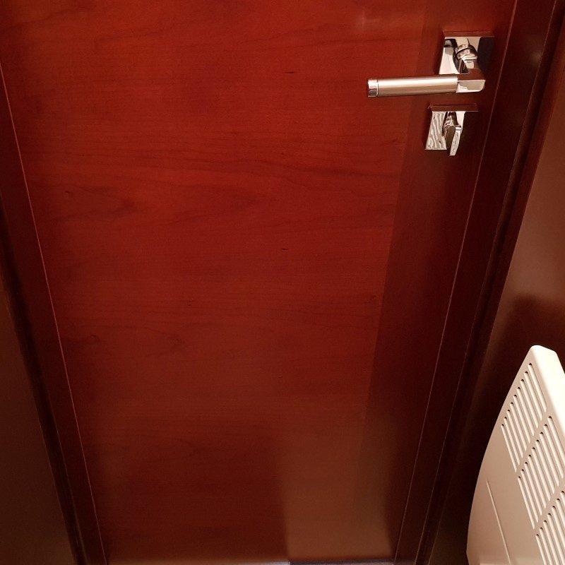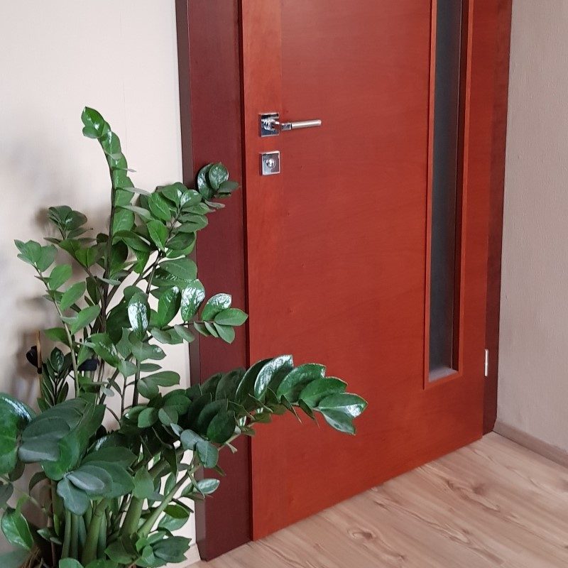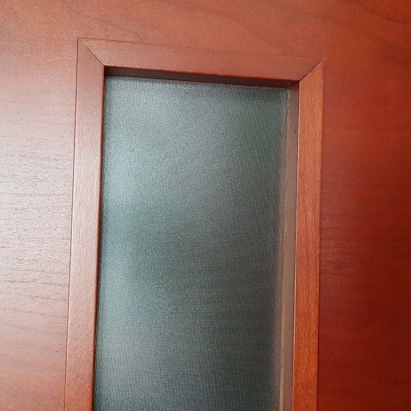 modern garzonlakás S 8000 IQ hat légkamrás német műanyag profilból kívül-belül fehér színben hőszigetelt két rétegű víztiszta üvegezéssel a fürdőben pácolt cseresznye színű Punto katedrál üveges furnér beltéri ajtóval